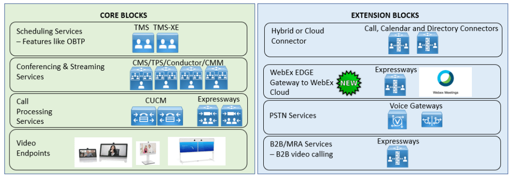 Lets understand the key building blocks and associated components of the on-prem Meeting solution which is shown below in Figure 1. These blocks are categorized under core and extension blocks. Core blocks provides essential video communications and the video calls stay within a siloed IT environment. With extension blocks, it is possible to extend the video communications towards PSTN, B2B, MRA and WebEx services allowing broader reachability.