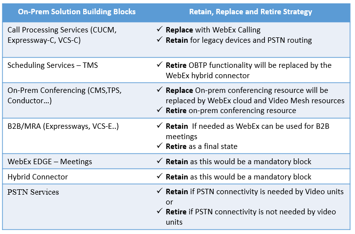 With the final state in mind, below you can see a simple framework to understand which solution blocks could be retained, replaced or retired based on your business requirements. As obvious not all on-prem building blocks are necessary after migration but some of them may need to be retained for short term or to provide some basic services like PSTN.