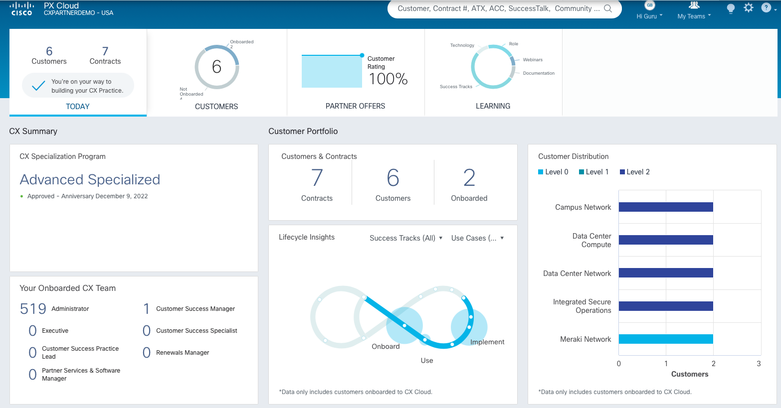 If you are not familiar with this infinity symbol below, it’s called Cisco CX racetrack that includes pitstops. Each pitstop is a stage of your customer’s technology lifecycle journey. The below screen grab from the PX cloud dashboard shows that 50% of your customers are in the onboard stage of their technology, be it campus network, data centre network or Meraki . This is a great insight correct ? but what can you do with this information? The PX cloud allows you to publish your offers called ATX (Ask-The-Expert) and Accelerator content combined with Cisco’s intellectual property to your customers based on your unique knowledge and relationship with your customers .