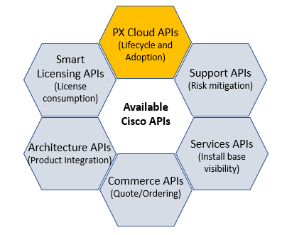 PX Cloud API’s are a fraction of APIs that are offered by Cisco toolsets for partners. On the top, partners might have home grown tools, customer success tools like Gainsight and adapted tools like ServiceNow that can be combined to build powerful applications. Below diagram depicts API’s available from multiple Cisco toolsets and their associated outcomes.