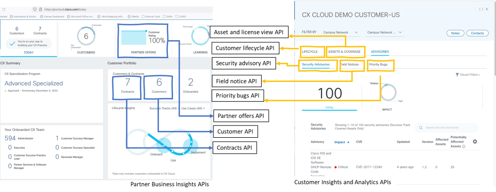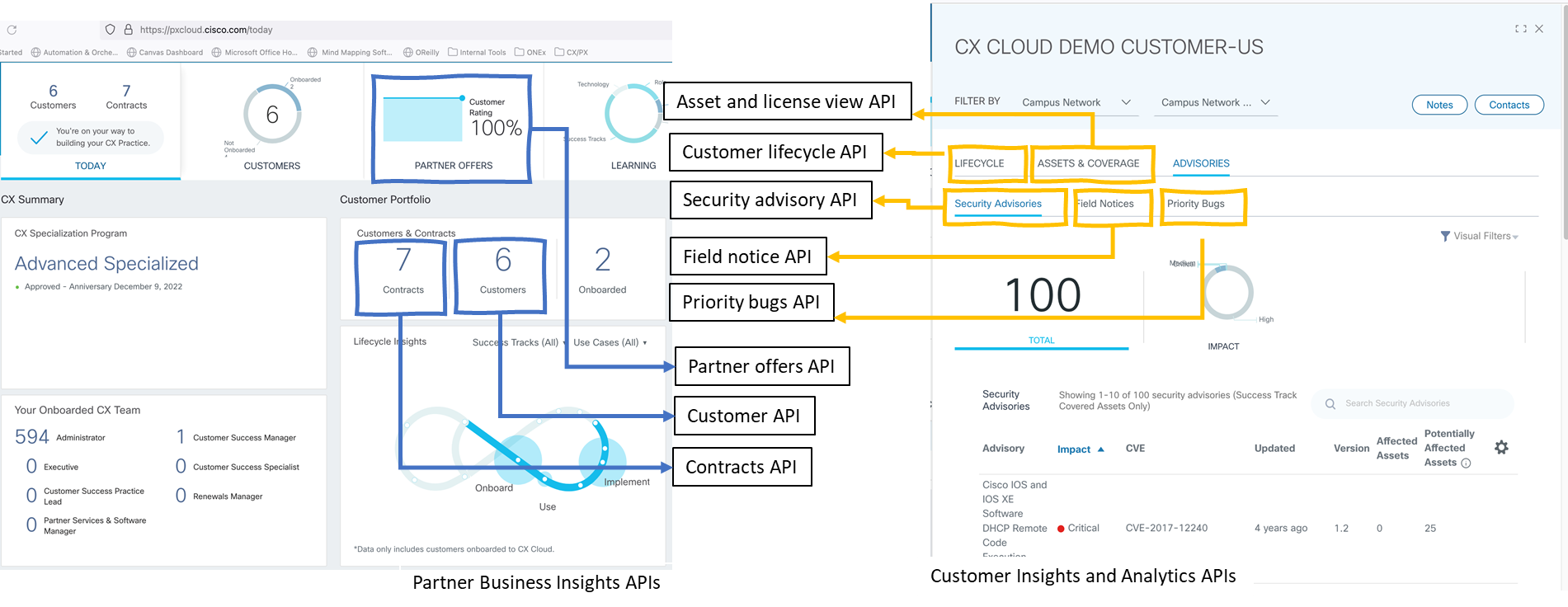 Cisco PX Cloud (Partner Experience) delivers customer and partner business insights to Cisco partners. These insights and capabilities are exposed through rich set of API’s that Cisco partners can integrate with their customer success platform. For example, Cisco partners who are using Gainsight platform, the Lifecycle API from the PX Cloud can relay the lifecycle stage of the customers to this platform. The partner CSMs can then view this Lifecyle insight right from their Gainsight dashboard and have a outcome driven conversation.