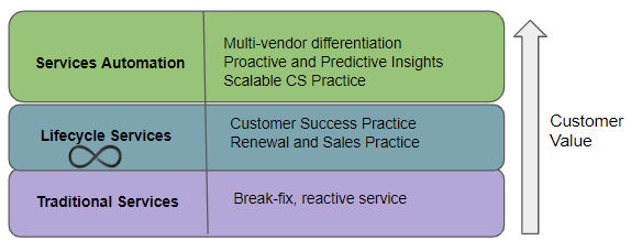 So how can technology vendors deliver along these lines to their customer base ? As many vendors move away from a traditional break-fix, reactive support towards a lifecycle approach of delivering professional services, automation becomes an inherent need to deliver customer value. Telemetry based proactive and predictive insights augments the customer success, renewal and sales teams by giving them the timely insights needed to service their customers. Insights around the customer lifecycle stage or upcoming renewals and having outcome based conversations greatly improves the customer adoption that could potentially result in successful renewals.