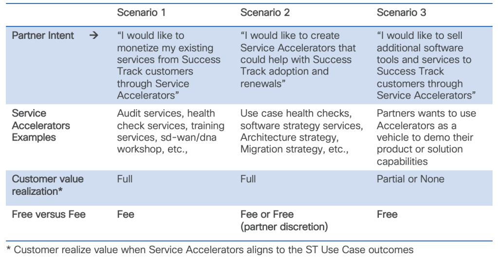 In the first scenario, the partner intends to convert some of their professional service offers into Service Accelerators and positions them to a particular Success Track lifecycle use case. Now it is assumed that this must be some kind of high value services that the partner was already monetising with their customers and makes perfect sense to charge a fee for this service. Please refer to the Service Accelerator examples from the above table