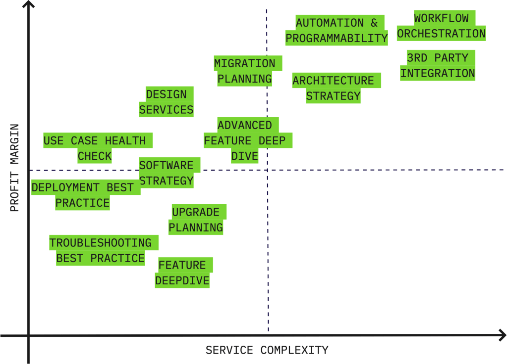 One of the key value proposition of Cisco PX (Partner Experience) cloud for Partners is the ability to offer and monetise high-margin services across their customer Lifecycle. Most often these high margin services have higher complexity in terms of the expertise and tools needed to deliver these services. Following chart depicts examples of various Lifecycle Service Accelerators in relation to their complexity and profit margin. For example, the workflow orchestration service accelerator on the upper right quadrant has the highest complexity resulting in higher profit margin.