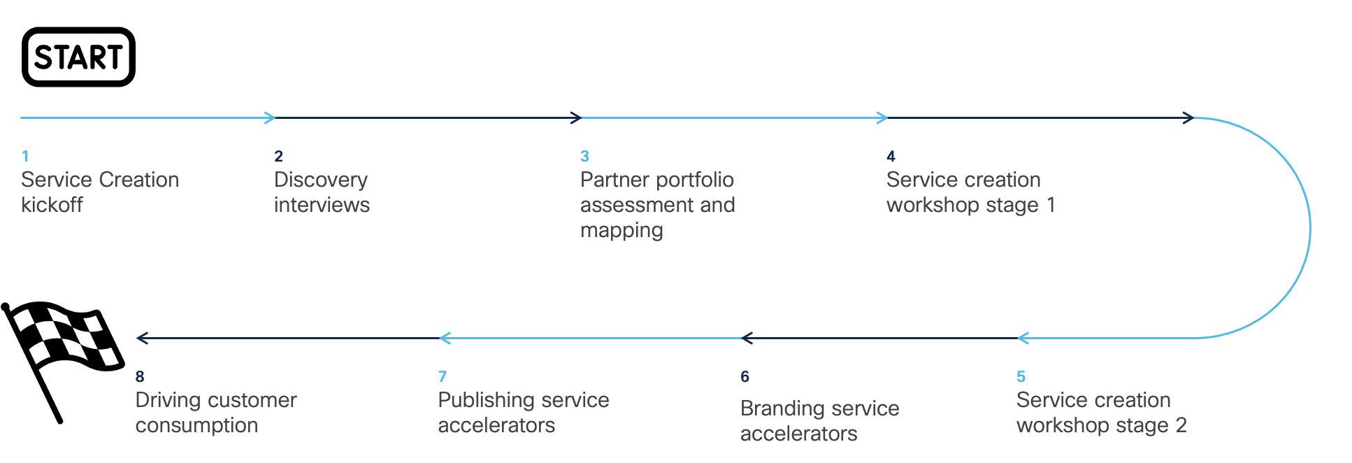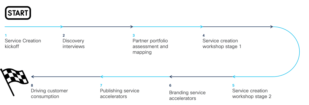 Cisco Partner Success team engages with CX specialised partners to ideate, build, publish and monetise lifecycle service accelerators leveraging user centered approach. Partner customer success, delivery and pre-sales teams are engaged in this process with Cisco partner success team. The engagement methodology as depicted below follows a structured 8-step process that starts from the kickoff, discovery interviews, portfolio mapping , ideation, branding and publishing the service accelerators. The final step or the success criteria is driven by customer consumption of the partner service accelerators which is really dependant on the value and differentiation created.