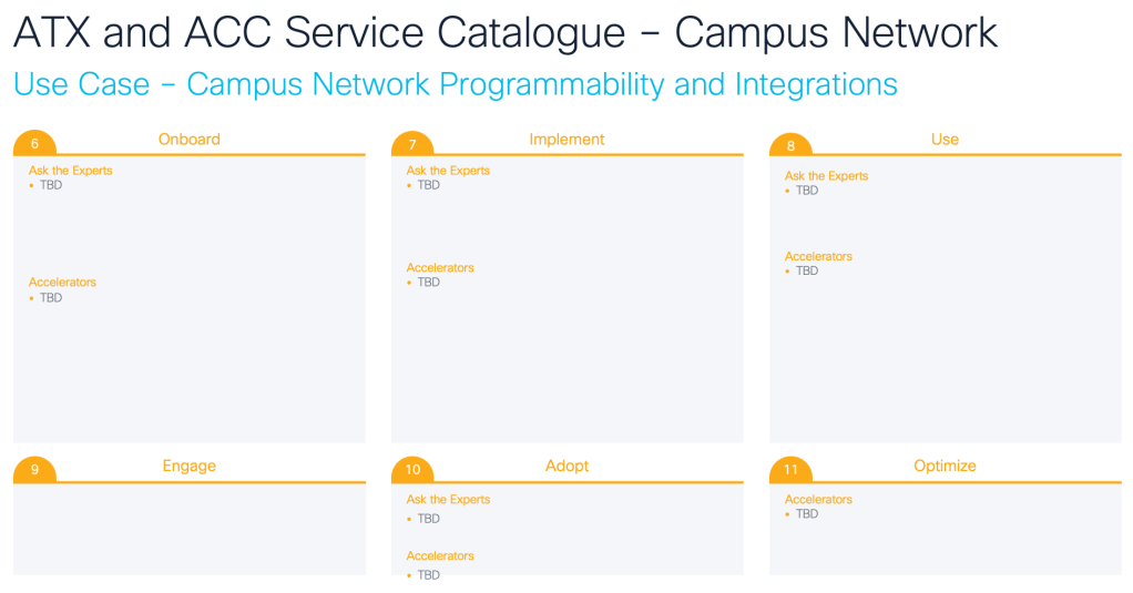 For partners who have already published their initial set of Accelerators and have demonstrated a strong commitment to the Success Track program with their customers, the next steps involve strategic planning. The CX leader should appoint dedicated owners for each Success Track and use case, who will be responsible for the ongoing development and maintenance of the Accelerator catalogue, organized by specific use case and lifecycle stages. The catalogue should clearly indicate the status of each Accelerator (whether it is ready, under development, or not yet started). As an example, the template below illustrates the structure for the Campus Network Success Track and the Campus Network Programmability use case.