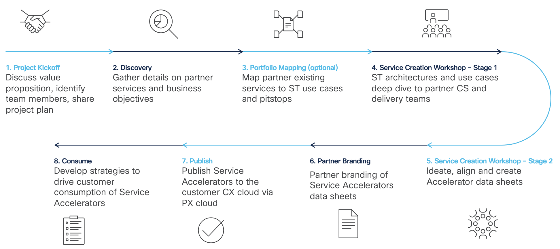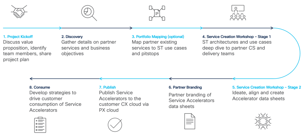 The Cisco Partner Success team has developed a comprehensive methodology that guides partners through the process of creating distinctive Service Accelerators. This empowers partners to unleash their creative potential and devise unique Accelerators tailored to their customers, leveraging their own expertise. Cisco CX Specialised partners who have successfully sold Success Tracks can request this workshop to collaborate with the Cisco Partner Success Teams and embark on this fruitful engagement. It truly exemplifies the value creation efforts of partners on top of the Cisco Success Track platform.