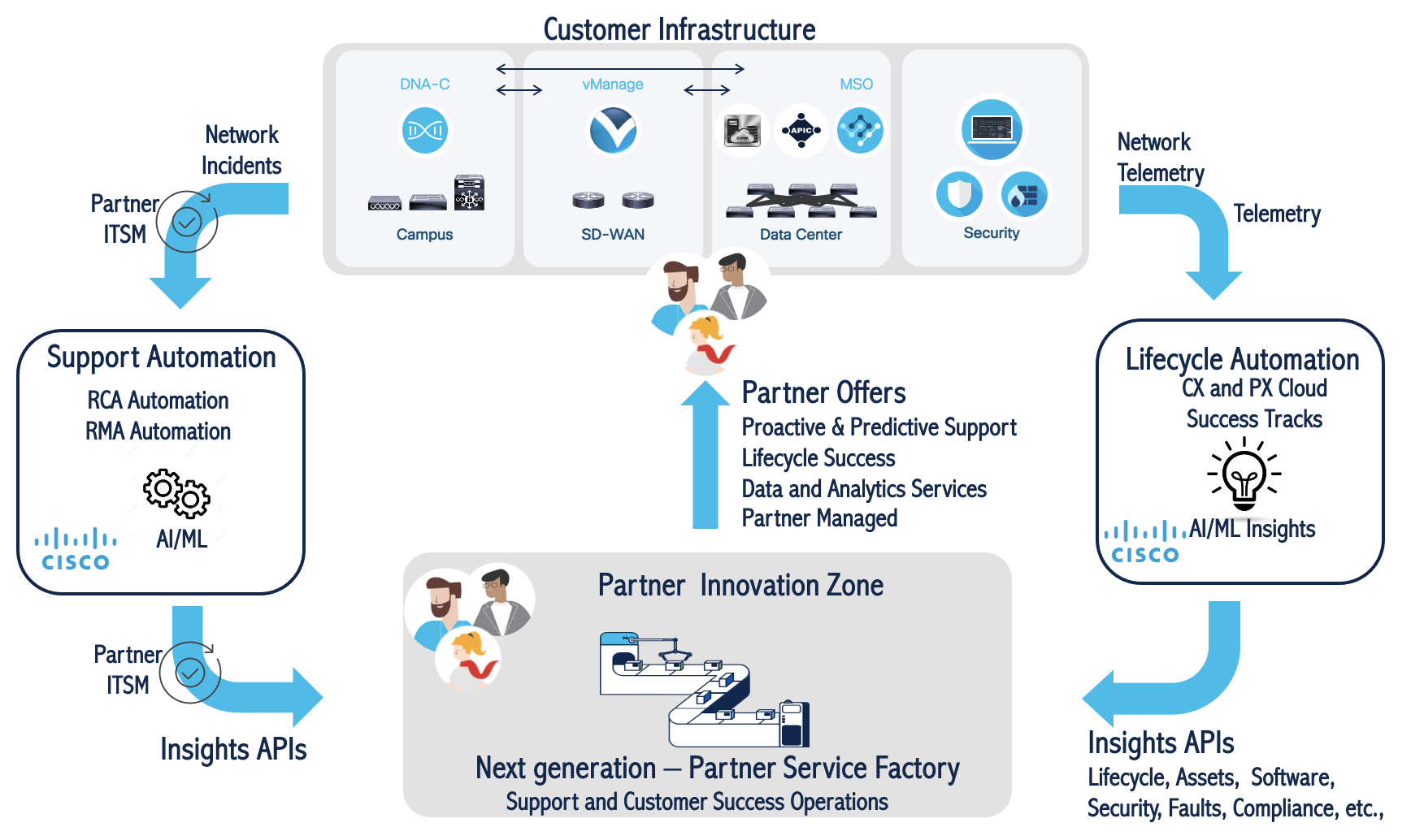 The above model describes this cyclical flow of data and engagement between the partner , customer and Cisco . The elements of the new partner service factory revolves around data, insights and automation which forms the underpinning for new services that will be created in the future. Innovation sits at the center among all other things to build the next generation partner service factory .