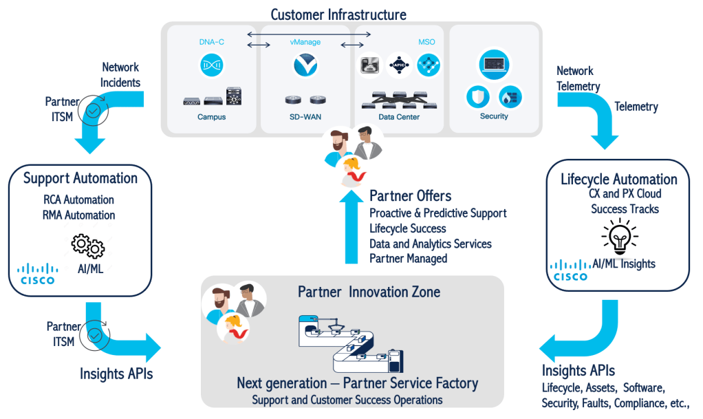 In this blog, I share systems view of Cisco CX (Customer Experience) partner model that allows them to unleash Cisco’s cutting edge automation and insights and transform their services business . So lets jump in. The Network Incident and telemetry data from customer’s infrastructure is ingested into Cisco’s cloud where deep analytics and automation processes are triggered. The data is churned inside Cisco cloud, combined with Cisco’s Intellectual property and machine learning models to derive insights on assets, software , lifecycle , security and made available to our partners through API’s (Application Programming Interface). Network incident data is analysed via highly automated root cause analysis and if necessitated an automated RMA (Return Material Authorization) process is triggered as well.
