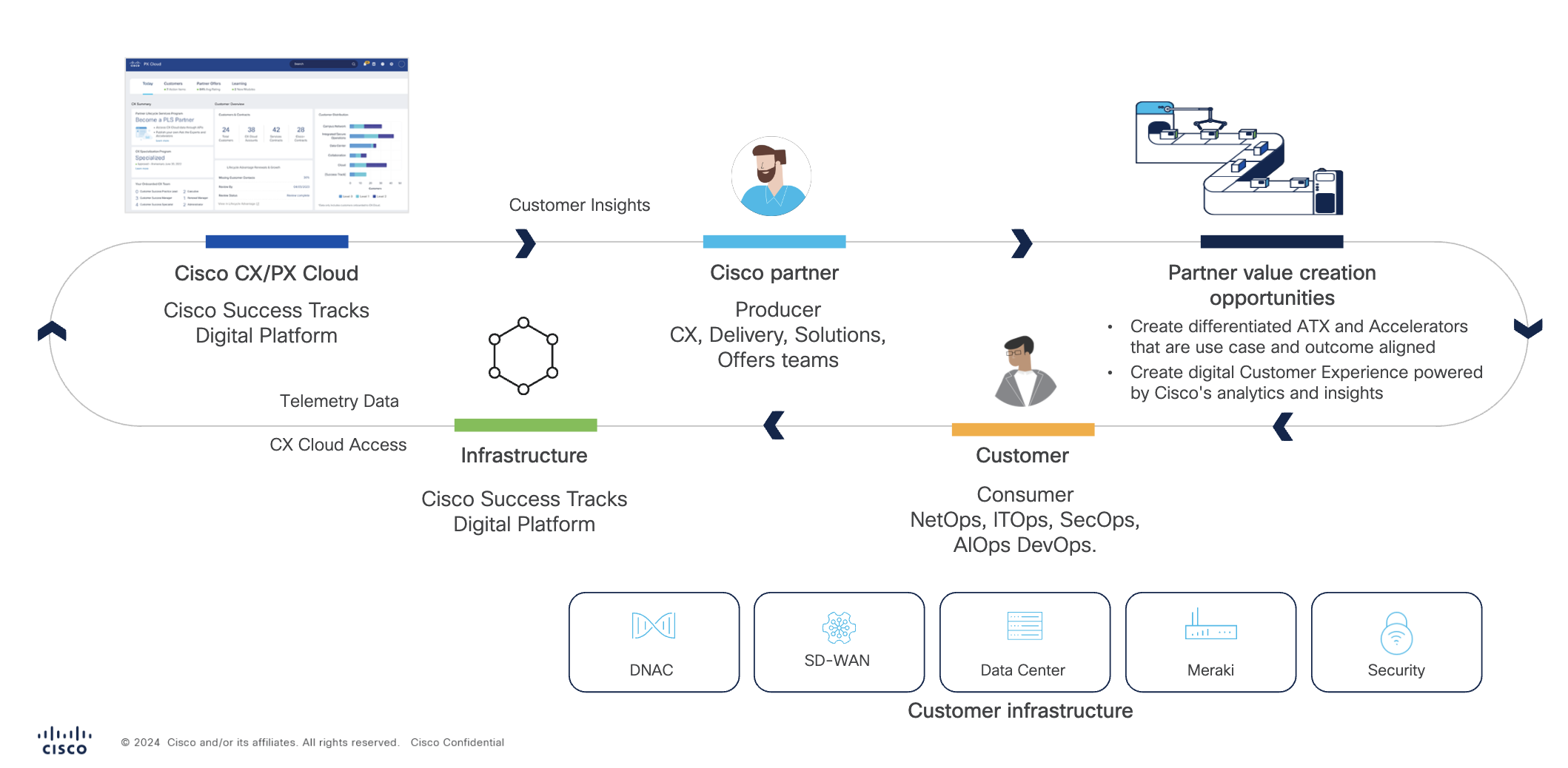 Lets take a step back and look at the below partner value creation model. Telemetry data from customer network infrastructure is informing and empowering the partner. This helps them create value-based services for their customers during the adoption and expansion phase of the product lifecycle. Without insight from the customer infrastructure it would be difficult to develop new services.