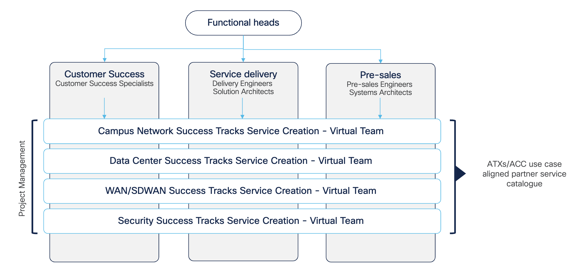 The first step was to create a partner cross-functional team of engineers, architects, delivery heads, and offerings team who could be engaged on this initiative. Given that there were multiple customer touch points from presales, delivery, support and customer success functions for the same customer, harnessing the collective the knowledge and experience of the entire team was a step in the right direction. Furthermore, different virtual teams was created for different architectures that composed of individuals from all the functions. Below shows the cross-functional team structure that was created within the partner firm during the course of the engagement.